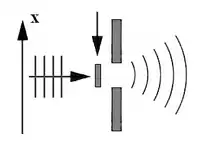 In order to follow his argumentation and to evaluate Bohr's response, it is convenient to refer to the experimental apparatus illustrated in figure A. A beam of light perpendicular to the X axis propagates in the direction z and encounters a screen S1 with a narrow (relative to the wavelength of the ray) slit. After having passed through the slit, the wave function diffracts with an angular opening that causes it to encounter a second screen S2 with two slits. The successive propagation of the wave results in the formation of the interference figure on the final screen F.