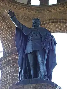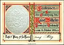 The Emperor William Monument (German: Kaiser-Wilhelm-Denkmal), near the town of Porta Westfalica in the North Rhine-Westphalian county of Minden-Lübbecke, is a colossal monument above the Weser gorge of Porta Westfalica, the "Gateway to Westphalia". It was erected to honour the first German Emperor, William I (1797–1888), by the then Prussian Province of Westphalia between 1892 and 1896[1] and emerged against the background of a rising German national identity. The monument, which is around 88 metres (289 ft)[1] high, is classified as one of Germany's national monuments.