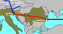 The Pan-European Pipeline (red) and its connection to the Transalpine Pipeline (blue)