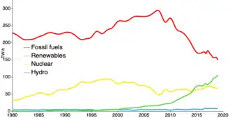 Government commitments to reduce emissions are occurring against a backdrop of economic crisis across Europe.[11] During the European financial crisis, Europe's consumption of electricity shrank by 5%, with primary production also facing a noticeable decline. Britain's trade deficit was reduced by 8% due to substantial cuts in energy imports.[12] Between 2007 and 2015, the UK's peak electrical demand fell from 61.5 GW to 52.7. By 2022 it reached 47.1  GW.[13][14][15]
