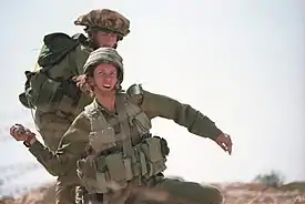 ![]() Israeli female recruits wearing the late-model version of the IDF Ephod combat vest, May 2002. | |