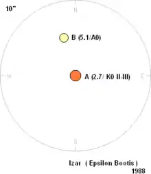 Epsilon Boötis (ε Boötis, abbreviated Epsilon Boo, ε Boo), officially named Izar (/ˈaɪzɑːr/ EYE-zar),[16] is a binary star in the northern constellation of Boötes. The star system can be viewed with the unaided eye at night, but resolving the pair with a small telescope is challenging; an aperture of 76 mm (3.0 in) or greater is required.[17]
