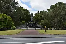 - Campbell Memorial Fountain and Statue – Located at the Manukau Road entrance to Cornwall Park is a baroque fountain commemorating Sir John Logan Campbell. It is made of a massive pile of basalt rocks surmounted by a red granite pedestal and an over life-sized bronze statue. The sculptor, Henry Alfred Pegram (1862–1937), was based in London and worked from photographs to achieve a likeness. On discovering that the completed statue would be mounted on such a large base he increased the scale of the statue. The statue was finally unveiled on Empire Day, 24 May 1906.[14]