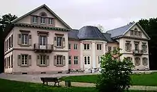 Eugénie then sold Schloss Eugensberg for 32,000 guilders to Heinrich von Kiesow of Augsburg.[1] The proceeds of that sale financed her rebuilding of Villa Eugenia in Hechingen, where the couple took up residence in 1834. At the southern edge of the villa's park, she acquired the Gasthaus Zur Silberburg and in 1844 rebuilt it as another villa, to house visiting noble relations. The surrounding gardens were also bought up and redesigned as an English landscape, now known as the Fürstengarten.