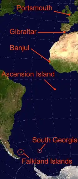 - ↑ "Bahia Buen Suceso set sail for South Georgia on 11 March carrying Argentine Marines". Rowland White, Vulcan 607, London, Bantam Press, p30.