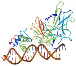 In 2001, the team identified in CS that the mutation is in the middle of a protein-coding gene.[5] Using a combination of bioinformatics and RNA analyses, they discovered that the gene codes for a novel protein belonging to the forkhead-box (FOX) group of transcription factors. As such, it was assigned with the official name of FOXP2. When the researchers sequenced the FOXP2 gene in the KE family, they found a heterozygous point mutation shared by all the affected individuals, but not in unaffected members of the family and other people.[5] This mutation is due to an amino-acid substitution that inhibits the DNA-binding domain of the FOXP2 protein.[70] Further screening of the gene identified multiple additional cases of FOXP2 disruption, including different point mutations[6] and chromosomal rearrangements,[71] providing evidence that damage to one copy of this gene is sufficient to derail speech and language development.