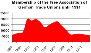 The Free Association of German Trade Unions (German: ⓘ; abbreviated FVdG; sometimes also translated as Free Association of German Unions[3] or Free Alliance of German Trade Unions)[4] was a trade union federation in Imperial and early Weimar Germany. It was founded in 1897 in Halle under the name Representatives' Centralization of Germany as the national umbrella organization of the localist current of the German labor movement. The localists rejected the centralization in the labor movement following the sunset of the Anti-Socialist Laws in 1890 and preferred grassroots democratic structures. The lack of a strike code soon led to conflict within the organization. Various ways of providing financial support for strikes were tested before a system of voluntary solidarity was agreed upon in 1903, the same year that the name Free Association of German Trade Unions was adopted.