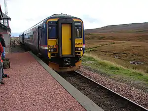 The accident occurred on the 18:20 passenger train from Glasgow Queen Street station to Oban which hit boulders on the line and derailed shortly before 21:00 BST (UTC+1).[2] The unit involved was Class 156 diesel multiple unit 156 499.[3] It was initially thought that two carriages had been left hanging over the 50-foot (15 m) embankment, although only one carriage was left in this position.[4] The leading bogie of the second carriage was also derailed.[5] There was a flash fire on the train, of insufficient duration to activate the on-board fire extinguishing system. Lubricating oil from a damaged engine crankcase had spilled on the sleepers, and ignited. The fire was quickly put out by the train conductor and a passenger with two hand fire extinguishers.[5]