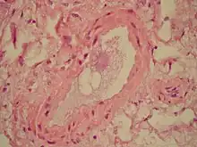 Microscopic section of the lungs showing a blood vessel with fibrinoid material and an empty space indicative of the presence of lipid dissolved during the staining process. Haematoxylin and eosin stain
