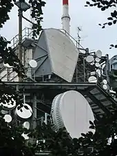 The tower has a triangular form with cut edges, is 51 metres (167 ft) high and has a 22 metres (72 ft) high pole on its top. It has 16 floors and an underground building for technical equipment. The antennas are on the terraces of the 5 top floors and on the roof. For its directional radio system there are parabolic antennas, horn and shell antennas. The power for directional radio is quite small in comparison to the Uetliberg TV-tower: 10W at the maximum for a connection from Felsenegg to Chasseral of about 110 kilometres (68 mi).[3]