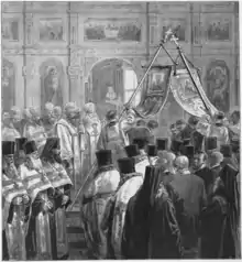 From 1806 the lower church was the site of burials of Georgian and Imeretian princes, and those of important members of Saint Petersburg society.[2][3] In total around 100 burials took place in the Feodorovskaya Church, though none have survived.[1] On 5 October 1889 the metropolitan approved a suggestion by the Spiritual Council to construct an extension to the church to allow further burials. This was built to a design by Grigory I. Karpov, and contained 167 spaces in its burial vault, with a two-tier iconostasis.[1] On 6 October 1891 it was consecrated as a separate church in the name of Saint Isidore of Pelusium by Metropolitan Isidore.[4][5] Over the 25 years of its operation some 150 burials took place, mostly those of bishops and church leaders.[3][4]