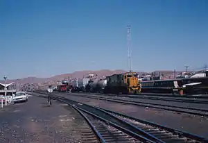 ![]() FCP #604, an ALCO Century 628, leads a short freight through Nogales in 1975. | |