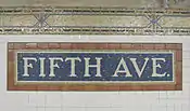 Replicas of BMT directional mosaics “QUEENS TRAINS” and “BROOKLYN TRAINS” are found on the western exit. Each mezzanine has one stair to each platform. Mosaics “5”, “Fifth Ave,” and the directional signs on each platform, are fully preserved with new tiles encircling around them.