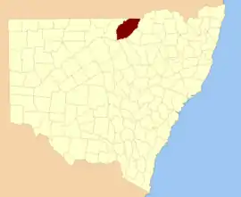 - ↑ "Finch County". Geographical Names Register (GNR) of NSW. Geographical Names Board of New South Wales. Retrieved 16 July 2015. , citing Atchison, J.F. (1980). 'The Counties of New South Wales'. The Australian Surveyor, Vol. 30, No. 1, pp.30-43. Not available online in July 2015 from the publishers, Taylor & Francis Online