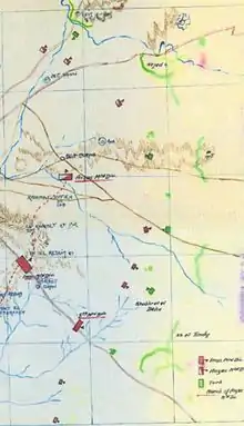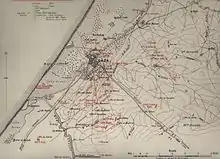 On 28 February, Chetwode's Desert Column occupied Khan Yunis unopposed and the headquarters of the Column was established at Sheikh Zowaiid, while Eastern Force headquarters remained at El Arish.[6] The ancient town of Khan Yunis on the main road to Gaza was said to be the birthplace of Delilah. With bazaars, narrow streets and a castle, it was one of several villages in this fertile area of southern Palestine, 6 miles (9.7 km) north of Rafa and the Egyptian–Ottoman frontier. Here was found the largest and deepest well in the area, and after engineers had installed a pumping machine, it gave an unlimited supply of water for both men and horses. The village quickly became an important forward site for supply depots and bivouacs.[8][25] Around Khan Yunis gardens, orange orchards, fig plantations and grazing were carried on by the local population, while in the Rafa and Sheikh Zowaiid areas barley and wheat were grown.[8][9][10]