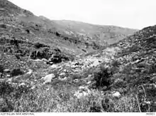 The infantry division followed the sealed metal road from the Ghoraniyeh crossing 6 miles (9.7 km) across the Jordan Valley before reaching the Shunet Nimrin defile at the foot of the hills of Moab.[75][76] The advance began at 08:30 on 24 March with the 181st Brigade on the right, the 179th on the left; each with two battalions in line with the 180th Brigade in reserve. The 2/14th Battalion London Regiment (179th Brigade) captured three officers and 33 men of the German 703rd Battalion near Shunet Nimrin at El Haud a cone-shaped hill north of the road and 6 miles (9.7 km) east of the Jordan River.[77]