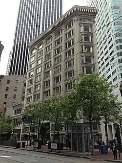 The Flatiron Building is a highrise completed in 1913 at 540 Market Street at Sutter Street in the Financial District of San Francisco, California. The 10-story, 120-foot (37 m) structure is designated landmark No. 155.[3]