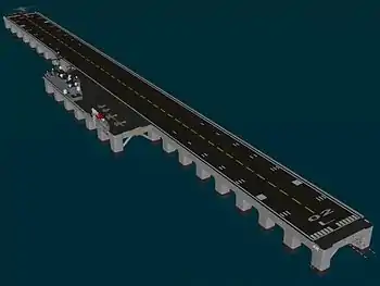 In 1943, a Floating Pontoon Flight Deck, 272 feet wide and 1,810 feet long was constructed by the Seabees at Allen Harbor using a total of 10,291 pontoons. It was towed to a cove in Narragansett Bay, where 140 takeoffs, landings and refuellings were successful in both smooth and rough waters. The pontoon airfield was noted to have advantages over aircraft carriers in lack of requirement for arresting gear for landings, and these could be executed at shorter time intervals. Tests showed that damage from four 100-pound bombs exploding on the floating deck did not interfere with flight operations and could be easily repaired.[4]