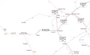 The Florida West Coast Railroad (reporting mark FWCR) was a 13-mile (21-kilometre) railroad owned by CSF Acquisition, Inc., which acquired it from CSX on December 13, 1987 as its first acquisition. Archived 2004-10-18 at the Wayback Machine It ran west from a CSX line at Newberry to Trenton.