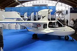 The Flywhale, built mainly from carbon fibre composite materials, is a flying boat style amphibian, with a single step hull and sponsons rather than wing tip floats. It accommodates two in side-by-side seating fitted with a single control between both seats. The design also provides room for two people to sleep in the fuselage.[1][2] A large, one-piece canopy hinges forward for access.[3] Behind the seats is a baggage area. The Flywhale has short-legged, tricycle landing gear[1] with mainwheels retracting backwards into the sponsons.[3] It can operate on land and water.[2]