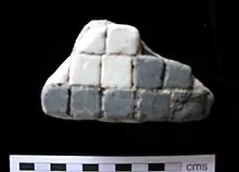 The villa was rebuilt sometime in the second century, and when S. E. Winbolt excavated room no. 41 in 1924, he found over 2 inches of burnt material beneath the flooring, suggesting that the villa may have been gutted by fire.[10] This second villa was more luxurious, and was complete with mosaics, painted walls, a bath house, and underfloor heating. The villa was rebuilt in roughly the same plan as before, but with enlarged rooms and corridors, an enlarged bath suite, and the addition of more rooms. Instead of tufa blocks, it was rebuilt with quarried and faced greensand stone, and on footings of rounded sea-stones laid on the gault clay.[10] Tufa blocks were taken from the old building, and in some cases used to build portions of Block B. In all, over 60 rooms have been discovered in three separate blocks.[4]