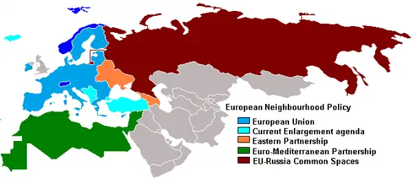 Libya is a member of the Southern Neighborhood, but has, unlike the other member states, no free trade agreement with the EU.[46] Libya is also not a member of the Union for the Mediterranean, but functions as an observer since 1999.[47]