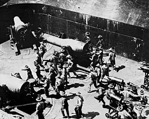 Following the American entry into World War I a number of changes took place at forts in the US, with a view to getting US-manned heavy and railway artillery into service on the Western Front. Fort Hancock was less affected than most forts, probably due to its being a primary defense for New York City. One 10-inch (254 mm) gun of Battery Halleck was removed for potential service as railway artillery; several other weapons including the other guns of Battery Halleck and the three 8-inch (203 mm) guns of Battery Arrowsmith were listed for removal but remained at the fort. Battery Engle's single 5-inch (127 mm) gun was removed for service as a field gun on a wheeled carriage and not returned to the fort, as were almost all of the 5-inch (127 mm) M1897 guns forcewide.[5] Also, four mortars (one from each pit) of Battery Reynolds-McCook were removed in 1917 to be remounted at the Highlands Military Reservation to the south of Sandy Hook. In 1917 construction began on two 12-inch (305 mm) batteries at Fort Hancock with two guns each on long-range barbette carriages; these were completed in 1921 and named Battery Kingman and Battery Mills.[5]