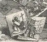 On one side of the road is a barber surgeon whose sign advertises Shaving, bleeding, and teeth drawn with a touch. Ecce signum! Inside the shop, the barber, who may be drunk,[34] haphazardly shaves a customer, holding his nose like that of a pig, while spots of blood darken the cloth under his chin. The surgeons and barbers had been a single profession since 1540 and would not finally separate until 1745, when the surgeons broke away to form the Company of Surgeons.[35] Bowls on the windowsill contain blood from the day's patients.