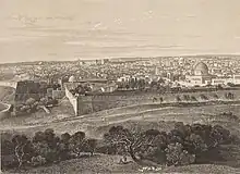 From Cairo, the delegation traveled by land to Jerusalem, where they stayed from December 11 to 14, 1839.[1] During these days, Fesque photographed Jerusalem from the Mount of Olives, including the Temple Mount, the city walls, and its surroundings.[13][14] From Jerusalem the expedition continued to Acre, where Fesque photographed the old city on its rooftops, the people staying there, and the Crusader fortress in the background. Finally, he photographed the city of Nazareth and its surroundings. From Nazareth, the delegation continued to Damascus, Turkey, and returned to Paris at the beginning of 1840.
