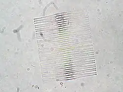 Fragilaria is a genus of freshwater and saltwater diatoms. It is usually a colonial diatom, forming filaments of cells mechanically joined by protrusions on the face and in the center of their valves. The individual diatoms appear swollen in their centers where they are joined to the colonial ribbon.[1] the genus grows as both plankton and benthic species, free living in colonies or epiphytic. Some species are bloom forming diatoms in eutrophic lakes. The type species is Fragilaria pectinalis Lyngbye from designating a lectotype from Conferva pectinalis O.F.Müller.[2] The taxonomy of the genus is still uncertain.[3]
