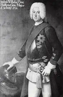 In 1733 Frederick William II was promoted to lieutenant general.[1] He participated in campaigns along the Rhine in 1734 and 1735 during the War of the Polish Succession. King Frederick II of Prussia was displeased with Frederick William after the Battle of Mollwitz during the First Silesian War in 1741. His regiment had been held in reserve and arrived on the battlefield too late to contribute to the battle. Unaware of the situation, he passed by several Austrian units. Nevertheless, King Frederick the Great was fond of the duke, whom he referred to as gute alte Holsteiner ("good old Holsteiner").[1] The duke was promoted to field marshal later that year and posted in Königsberg, the capital of East Prussia. He was also a recipient of the Order of the Black Eagle.[4]