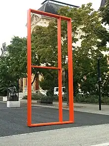 In 1991 for the opening of Frankfurt's Museum für Moderne Kunst, Förg produced a colorful wall piece for the central stairway, which together with a bronze relief formed a contrast to the architectural structure of the post-modern museum architecture.[10][11] In 2000, he was commissioned with designs for Swiss Re's Centre for Global Dialogue in Zurich. For this project Forg handled the color design for all of the interiors in the 1920s Villa Bodmer and installed two enormous tubes of raw metal in its central entrance hall.[12]
