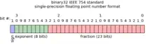 • an 8-bit integer exponent field with an assumed offset of 127 (so a value of 127 represents an exponent value of 0) and with a base of 2 meaning that the exponent value specifies a bit shift of the fraction field, followed by