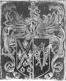 Monumental brass mural monument in Washfield Church, Devon, erected by Montgomery in memory of his mother-in-law Alice Fry (died 1605). His arms are shown on the escutcheon at sinister, impaling Steyning: Argent, a bat displayed sable.