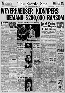 The kidnapping of nine-year-old George Weyerhaeuser[lower-alpha 1] occurred in 1935 in Tacoma, Washington, United States. The son of prominent lumberman J. P. Weyerhaeuser, George was successfully released for ransom and eventually succeeded his father as the chairman of the Weyerhaeuser company. The four participants in the kidnapping were apprehended and sentenced to prison terms totaling 135 years.[lower-alpha 2]