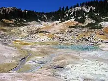 The geothermal areas in Lassen Volcanic National Park include several groups of hot springs and fumaroles, as remnants of former volcanic activity, exist in Lassen Volcanic National Park in northeastern California. Most of these lie in or are closely adjacent to Mount Tehama's caldera. Bumpass Hell is the most spectacular of these, but others of importance are Sulphur Works, Little Hot Springs Valley, Boiling Springs Lake and Devil's Kitchen. In each thermal area, the highest temperature of water generally is close to the boiling temperature at the altitude of the particular spring or fumarole — 198 °F (92 °C) at Bumpass Hell and 191 °F (88 °C) on the northwest flanks of Lassen Peak.[1] Temperatures as high as 230 °F (110 °C) have been recorded in the park.