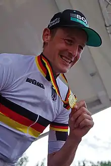 Fabian Wegmann (pictured at the 2007 Tour de France) is one of seven cyclists to have won three championships (in 2007, 2008, and 2012).