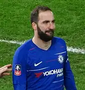 On 23 January 2019, English club Chelsea signed Higuaín on a loan deal for the remainder of the 2018–19 season, reuniting him with manager Maurizio Sarri, whom he played under at Napoli during the 2015–16 season.[93] Five days later, he made his debut in a 3–0 win against Sheffield Wednesday in the fourth round of the FA Cup at Stamford Bridge.[94] On 30 January, he made his league debut in a 4–0 away loss against AFC Bournemouth.[95] On 2 February, he scored his first goals for Chelsea, a brace in a 5–0 home win over Huddersfield Town.[96]