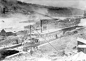 ![]() Governor Grover in Willamette Locks, March 1873, shortly after completion of locks | |