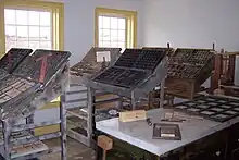 On June 26, 1829, the twenty-three-year-old Grandin announced in the Wayne Sentinel that he intended to publish the Book of Mormon, once the translation was complete.[13] Oliver Cowdery prepared a copy of the book's manuscript, and Grandin bought 500 pounds of small pica type for use in the publication. The chief compositor, John H. Gilbert, found that the manuscript was "closely written and legible, but not a punctuation mark from beginning to end." Gilbert said that he added punctuation and capitalization in the evenings. To print the book, Grandin used a Smith Improved Printing Press, which had first appeared on the market about 1821 and was the most up-to-date press available to the small printer of the day.[14] The original press used by Grandin to print the Book of Mormon, is currently located in the Church History Museum in Salt Lake City, Utah.