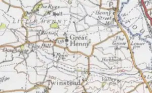 Great Henny is a village and civil parish in the Braintree district[1] in the county of Essex, England. Nearby settlements include the villages of Little Henny and Twinstead and the Suffolk market town of Sudbury. The hamlet of Henny Street, within the parish, is on the River Stour which forms the parish's eastern border. It shares a parish council with Little Henny and Twinstead called "Hennys', Middleton & Twinstead".