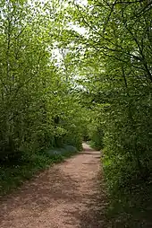 The National Historic Site is largely divided into two areas, Montgomery's home and Green Gables.[6] The former served as the home for the author of Anne of Green Gables and consists of the ruins of her home and other farm buildings from the late-19th century.[6] Green Gables is situated to the west of Montgomery's home; with the lands surrounding Green Gables also including a historic schoolhouse, farm buildings, and trails.[6] In 2019, an interpretive centre built north of Green Gables was opened to the public, and houses exhibitions on Montgomery and her novels, particularly Anne of Green Gables.[8] Designed by Root Architecture, the centre includes exhibition spaces, gift shop, and offices. The interpretive centre surrounds a courtyard. Timber framing and panels is used throughout the interpretive centre.[8]