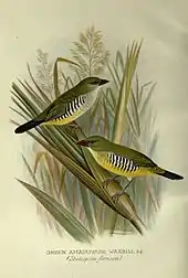 The green avadavat or green munia (Amandava formosa) is a species of Estrildid finch with green and yellow on the body, a bright red bill and black "zebra stripes" on the flanks. They are endemic to the Indian subcontinent and were formerly popular as cagebirds. The name "avadavat" is a corruption of the name the city of Ahmedabad in Gujarat, India, which was a centre of bird trade.[3] They have a restricted distribution and populations are threatened by the bird trade.