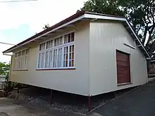 The second new building was a two-room temporary classroom building with a gabled roof (in 2018 named Block T). This was built between the main building and the domestic science block in early 1951, and was initially used for commercial classes.[53][54] Only a relatively small number of temporary classroom buildings were constructed between 1943 and 1951. This standard type, of which Block T in Gympie is a good example, was introduced as a temporary solution to the exceptional growth in student numbers during WWII and the immediate post-war period, when skilled labour was scarce and materials were in short supply. They were small timber buildings, lowset on concrete posts and had skillion or gabled roofs. External walls were clad with vertical tongue and groove (T&G) timber boards and the rear wall had casement windows with operable fanlights sheltered by a simple hood. Accessed from a verandah, the type comprised two classrooms 21 by 18 feet (6.4 by 5.5 m).[55][56][57][1]