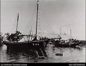 ![]() Mavie (later HMAS Mavie) and other luggers resting in harbour during the 1939 storm season | |