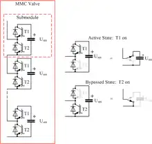 ![]() Operating principle of Modular Multi-Level Converter (MMC) for HVDC, with four series-connected submodules per valve. For clarity only one phase of the three is shown. |