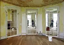 After the house was secured to its new foundation, workers began restoring it.[243] The federal government provided another $3 million in funding through a stimulus package.[178] The piazzas were rebuilt, and the main entrance was restored at its original position.[244][245] Restoration architects spent 18 months consulting documents to ensure that the restoration was historically accurate.[245] The grounds were landscaped with 13 sweet gum trees, a stone wall, a circular rose garden, and paths.[32] The renovation also included new electrical and mechanical systems,[246] and Fallon and Wilkinson were hired to create replicas of the original furniture.[244] During the renovation, contractors rediscovered some of the original materials, using them to rebuild some of the original details.[245][238] The project cost $14.5 million in total.[245][247]