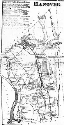 Hanover Township was one of the original townships laid out by the Susquehanna Company of Connecticut. Captain Lazarus Stewart and dozens of his followers moved from Lancaster County into the Wyoming Valley in 1770; they fought for Connecticut in the Yankee-Pennamite Wars. For their service to Connecticut, Captain Stewart and his followers were granted a tract of land which became Hanover Township. The community was named after Lazarus Stewart's hometown of Hanover in Dauphin County, Pennsylvania. In the early 1770s, Captain Lazarus Stewart built the first house in the Breslau section of the township (between Solomon Creek and the Susquehanna River).[3]