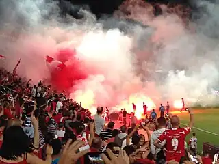 Ultras Hapoel often wave flags emblazoned with the faces of Che Guevara and Karl Marx, as well as banners with the slogan "Workers of the world, unite!".[13] The club ultras has friendships with many other antifa supporter groups, including strong bonds with fans of FC St. Pauli, Standard Liège, Omonia Nicosia, and Celtic F.C.[9][10][11][12]