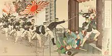 The Japanese force tasked with assaulting the gate found itself outnumbered and immobilized by Chinese suppression fire. Jūkichi was selected as one of a 13-member forlorn hope charged with climbing the walls. Once inside, Jūkichi and his team were engaged by numerous Chinese warriors. Fending them off, Jūkichi himself opened the Hyeonmu Gate and thereby admitted the Japanese into the city. Pyongyang quickly fell as the Chinese forces within the city routed.[1][2]